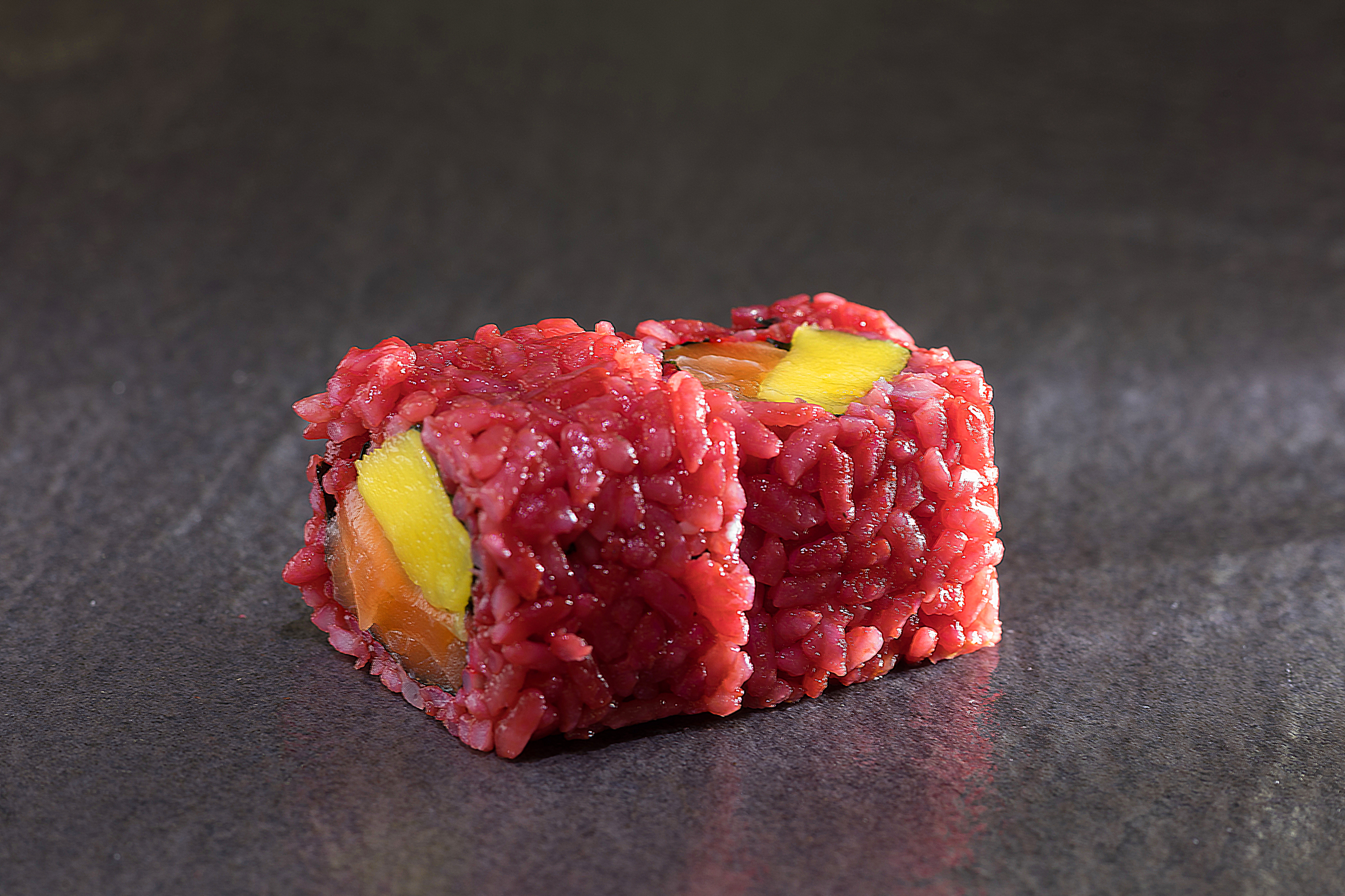 6 Stücke Inside Out mit Rote Beete Reis, süßer Mango und frischem Lachs (4,B,E,2,G)