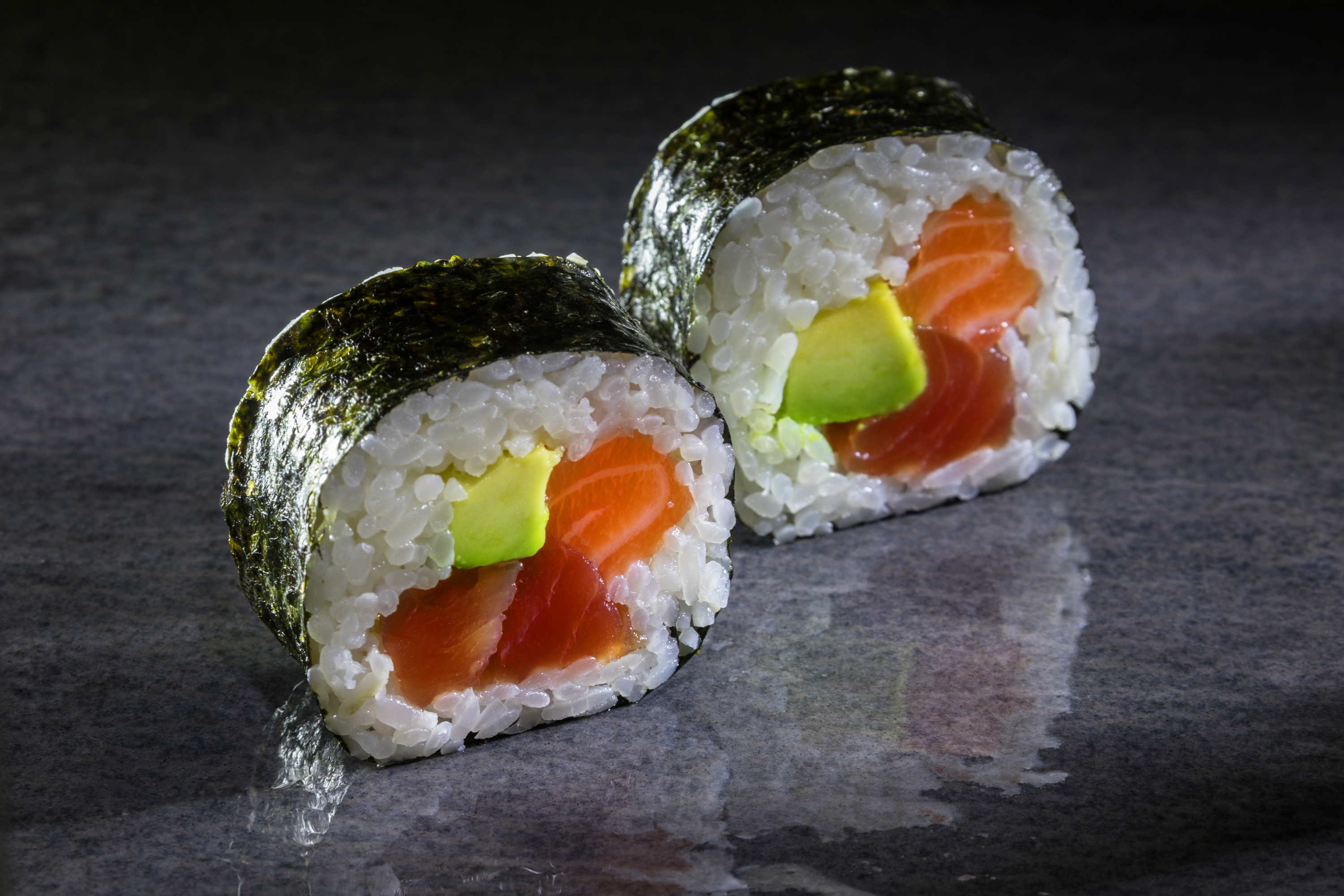 8 Stücke Futo Maki gefüllt mit Thunfisch, Lachs und Avocado (4,B,E)