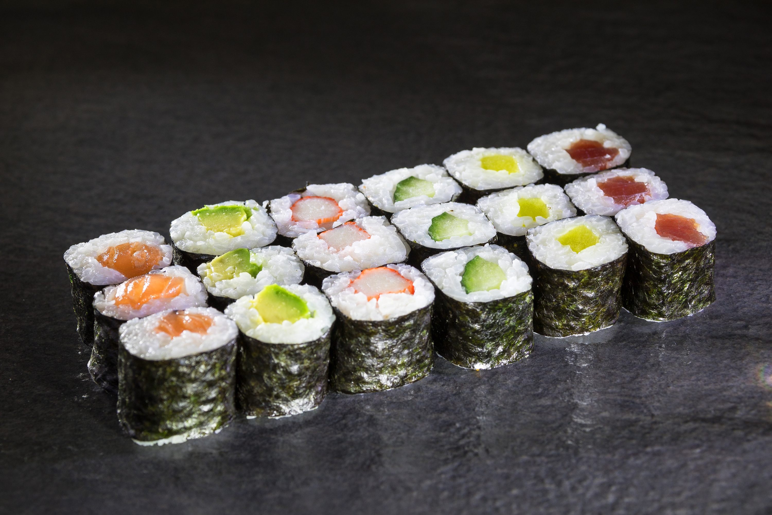 Je 3 Stück: Shake Maki, Avokado Maki, Kappa Maki, Oshinko Maki, Tekka Maki, Kani Maki (4,B,6,8,1,7,2)