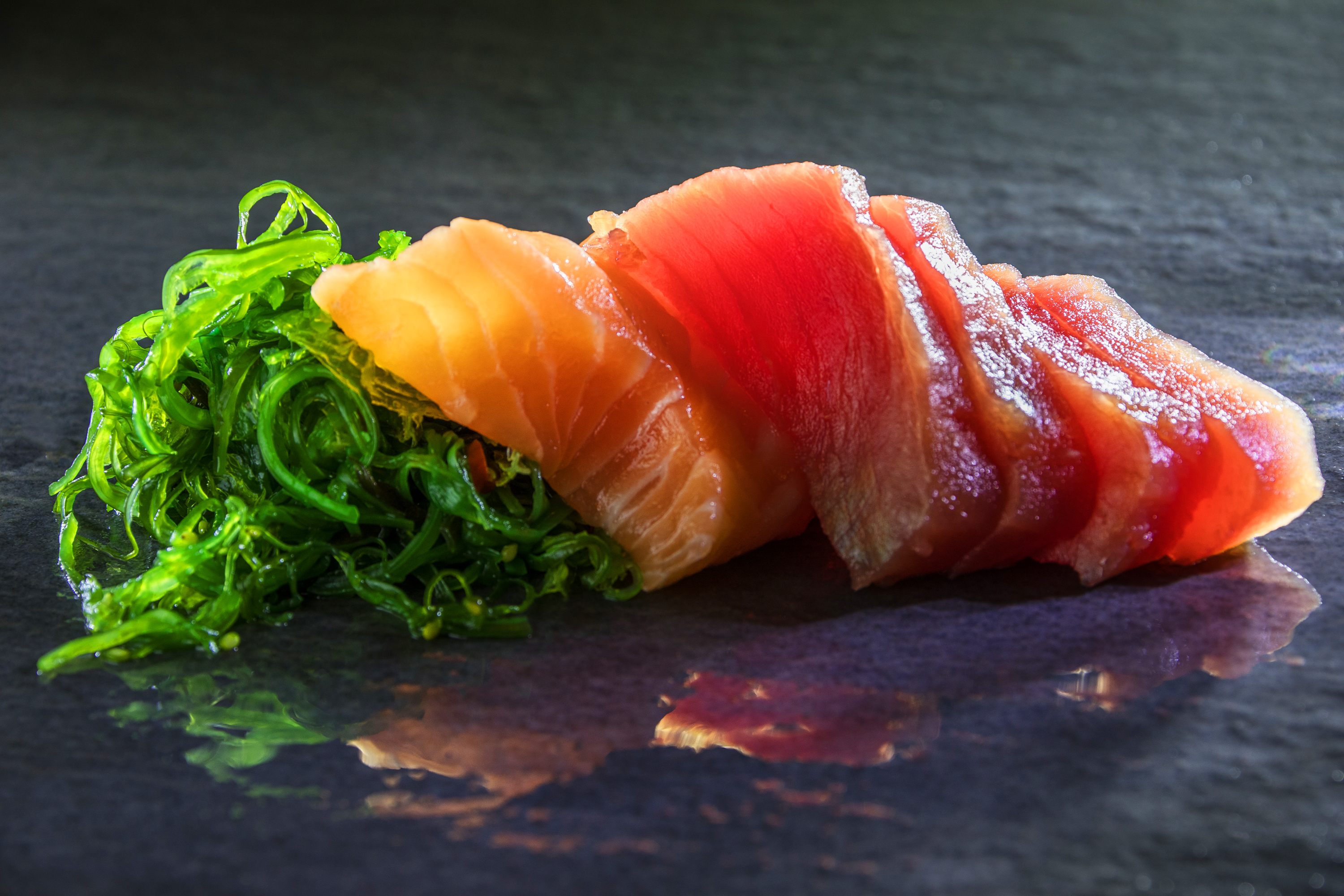und jeweils 4 Scheiben frischer Thunfisch und Lachs (E)