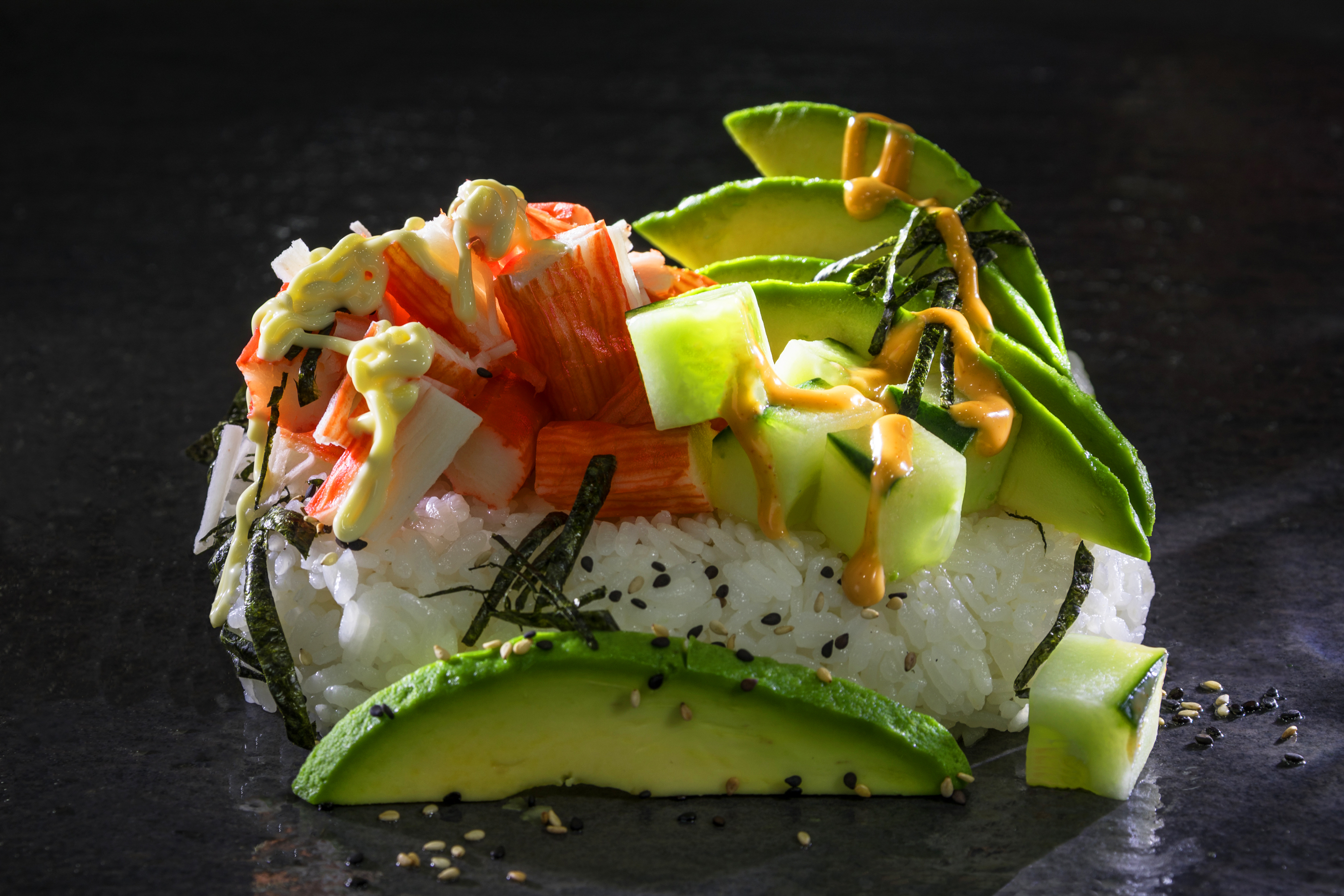 Sushi Bowl mit Reis, Surimi, Avocado, gurke und Sriracha-Mayonnaise, Algenstreifen und Sesam  (4,B,1,7,A,9,E,6,2,11,G,10,8,C,J)