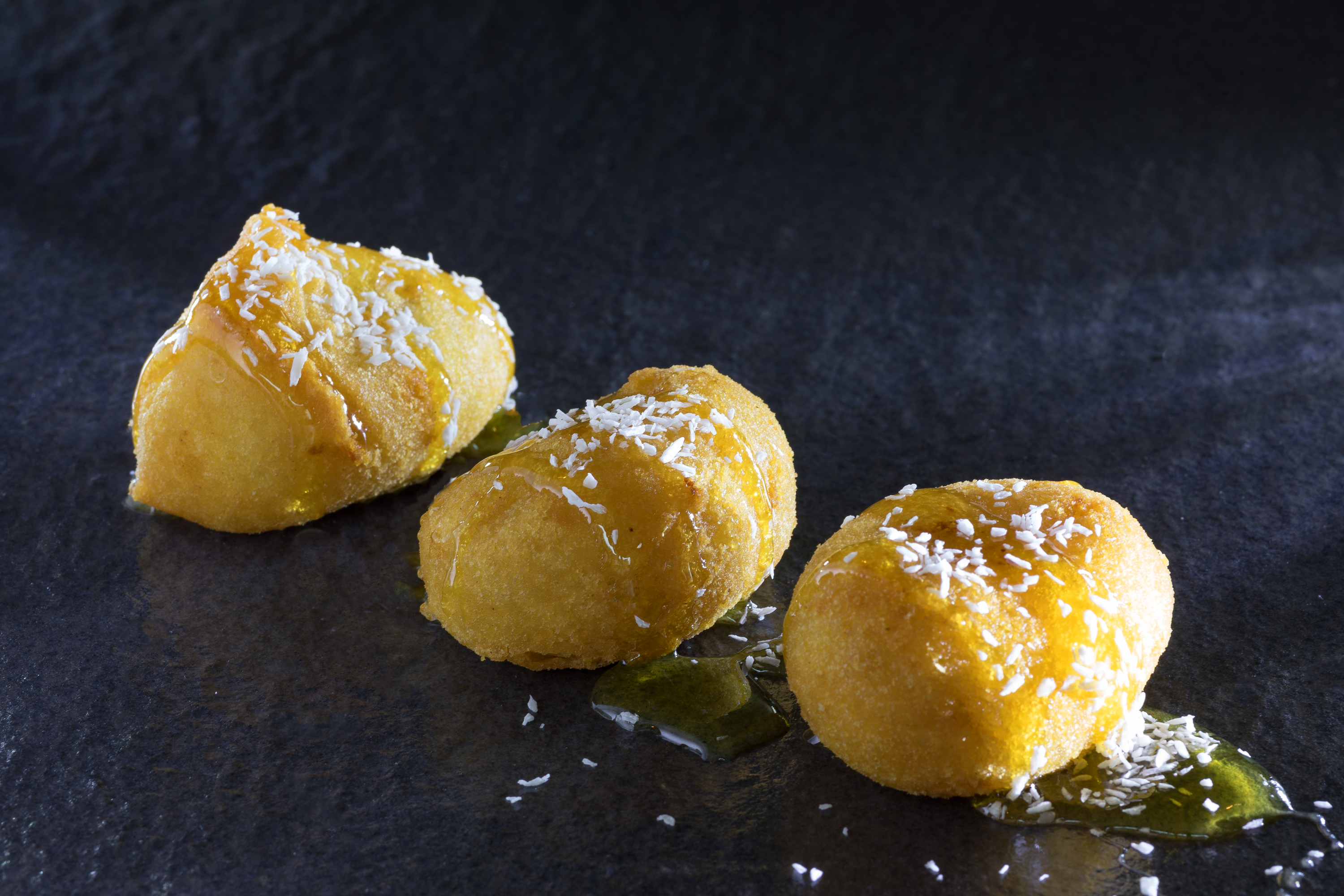 3 frittierte Bananenbällchen mit Kokos und Honig